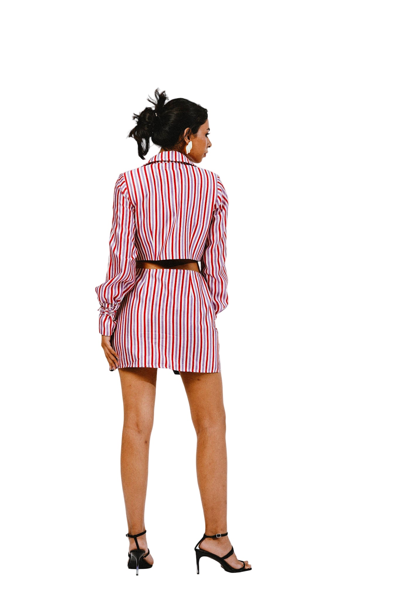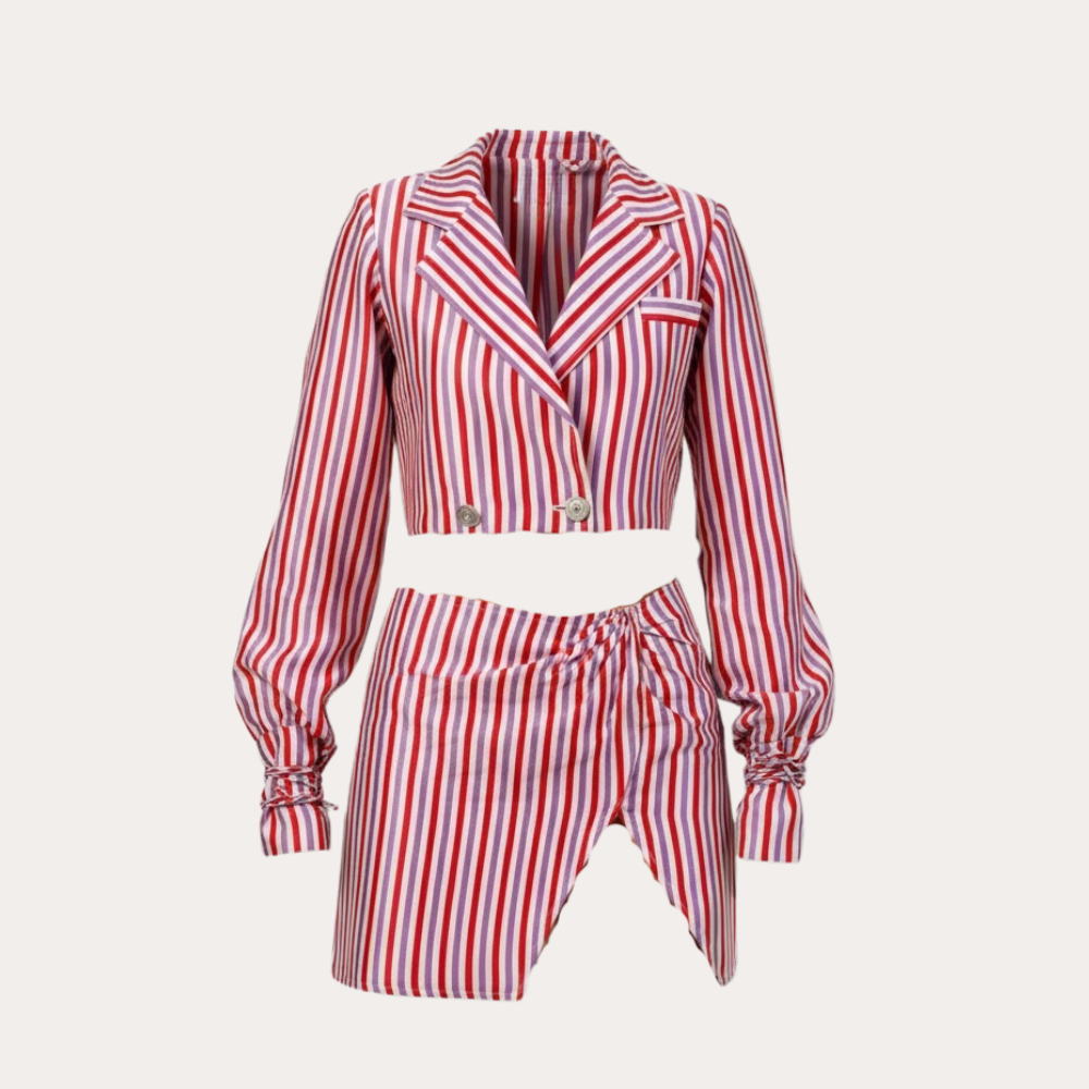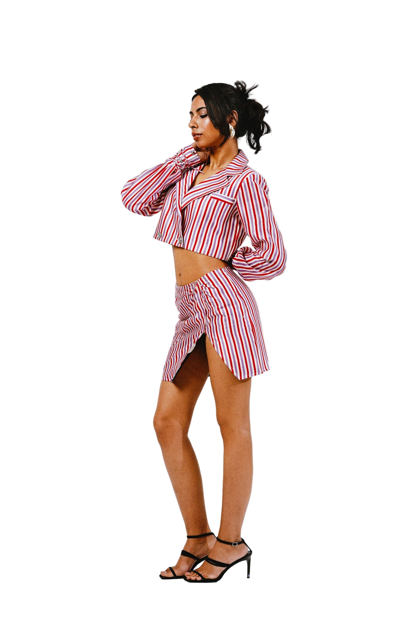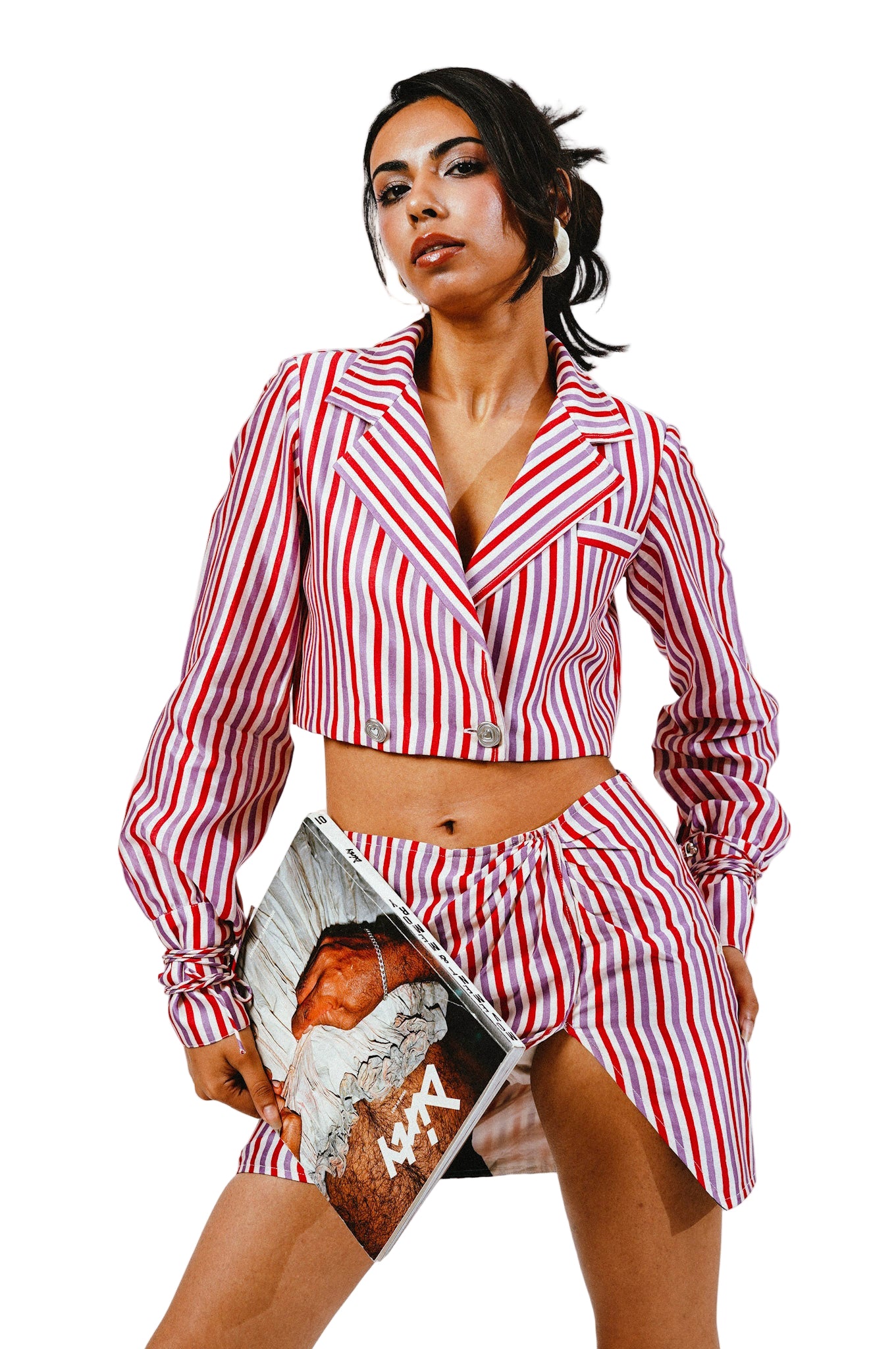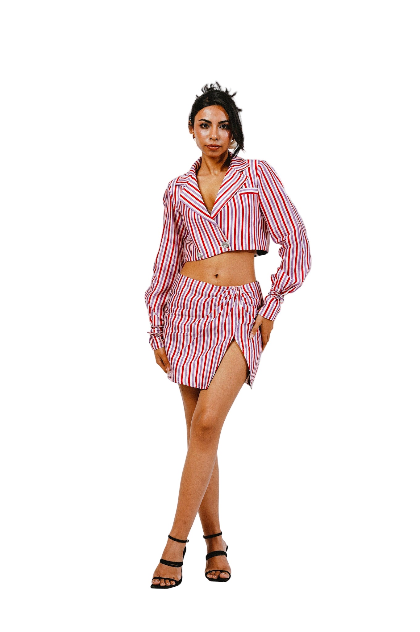Wear the Blazer with wide-leg denims for a weekday upgrade, or throw the skirt on with a vintage tee and sneakers for an off-duty vibe. Together? Best served with bold lips, platform heels, and absolutely no apologies.