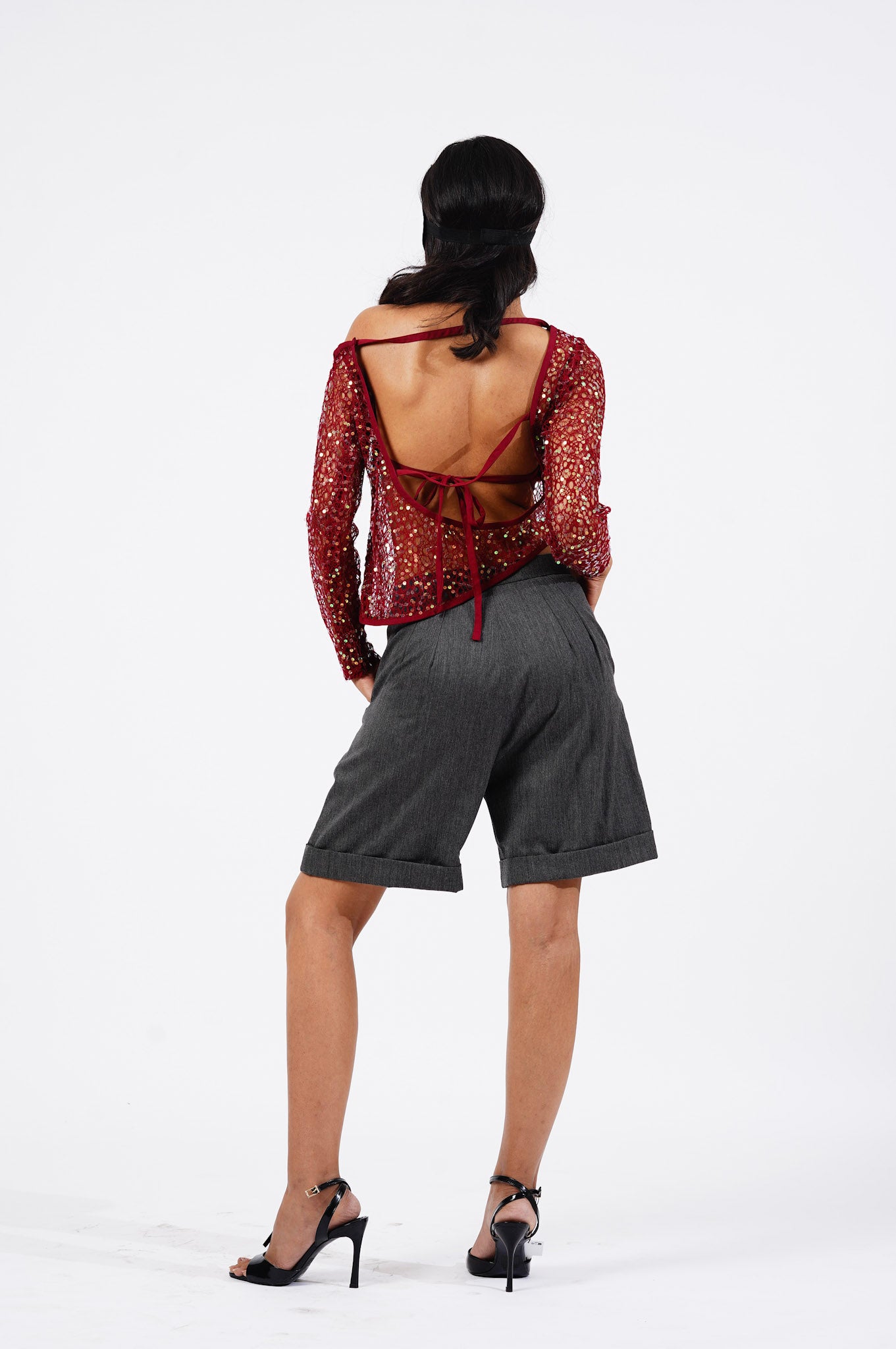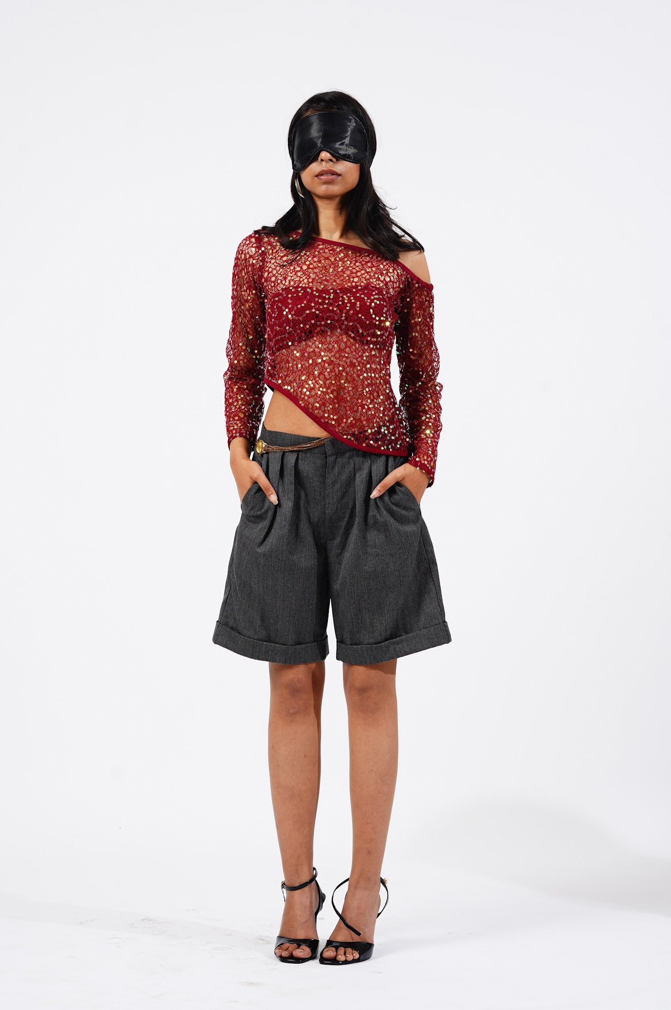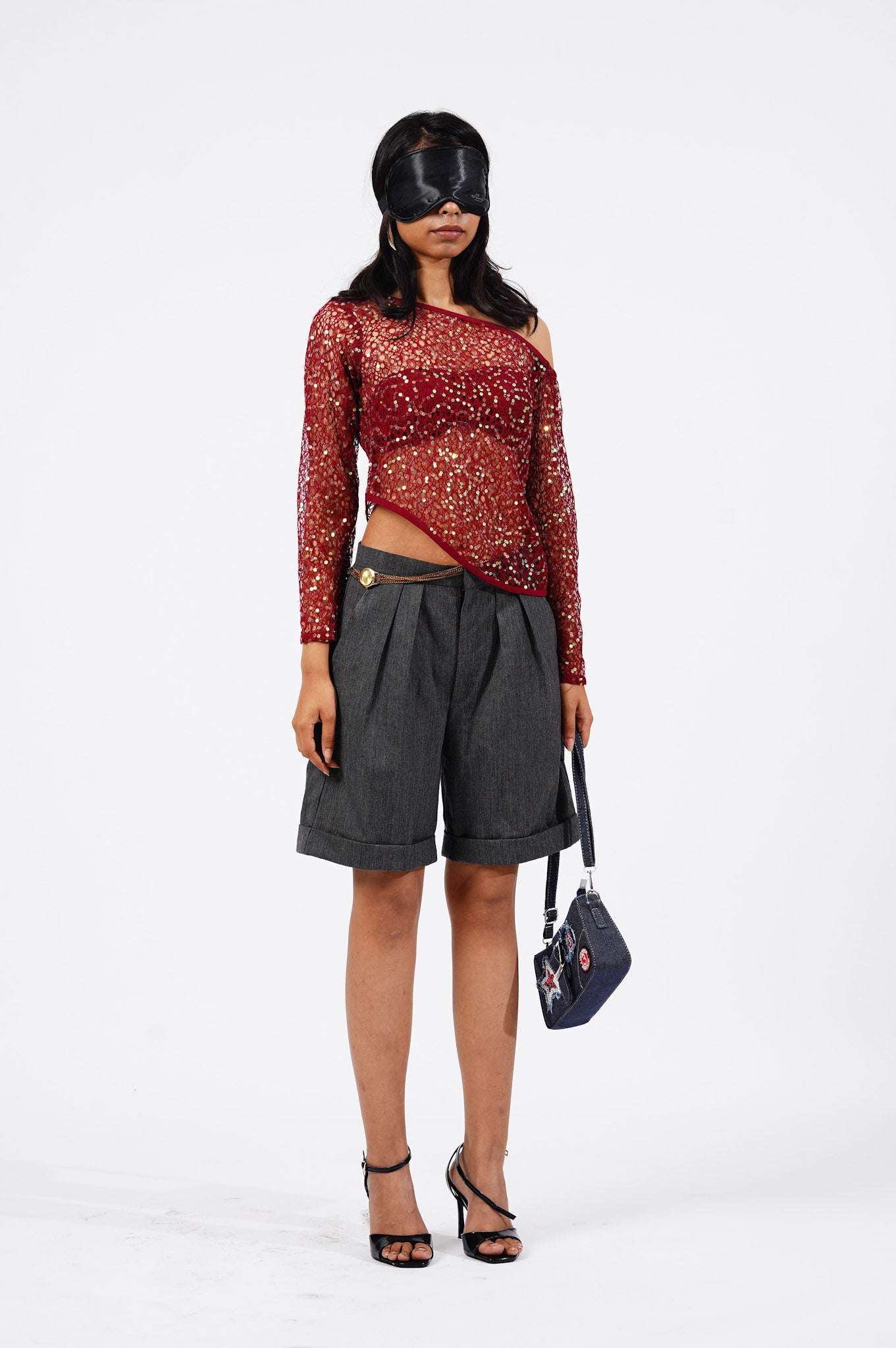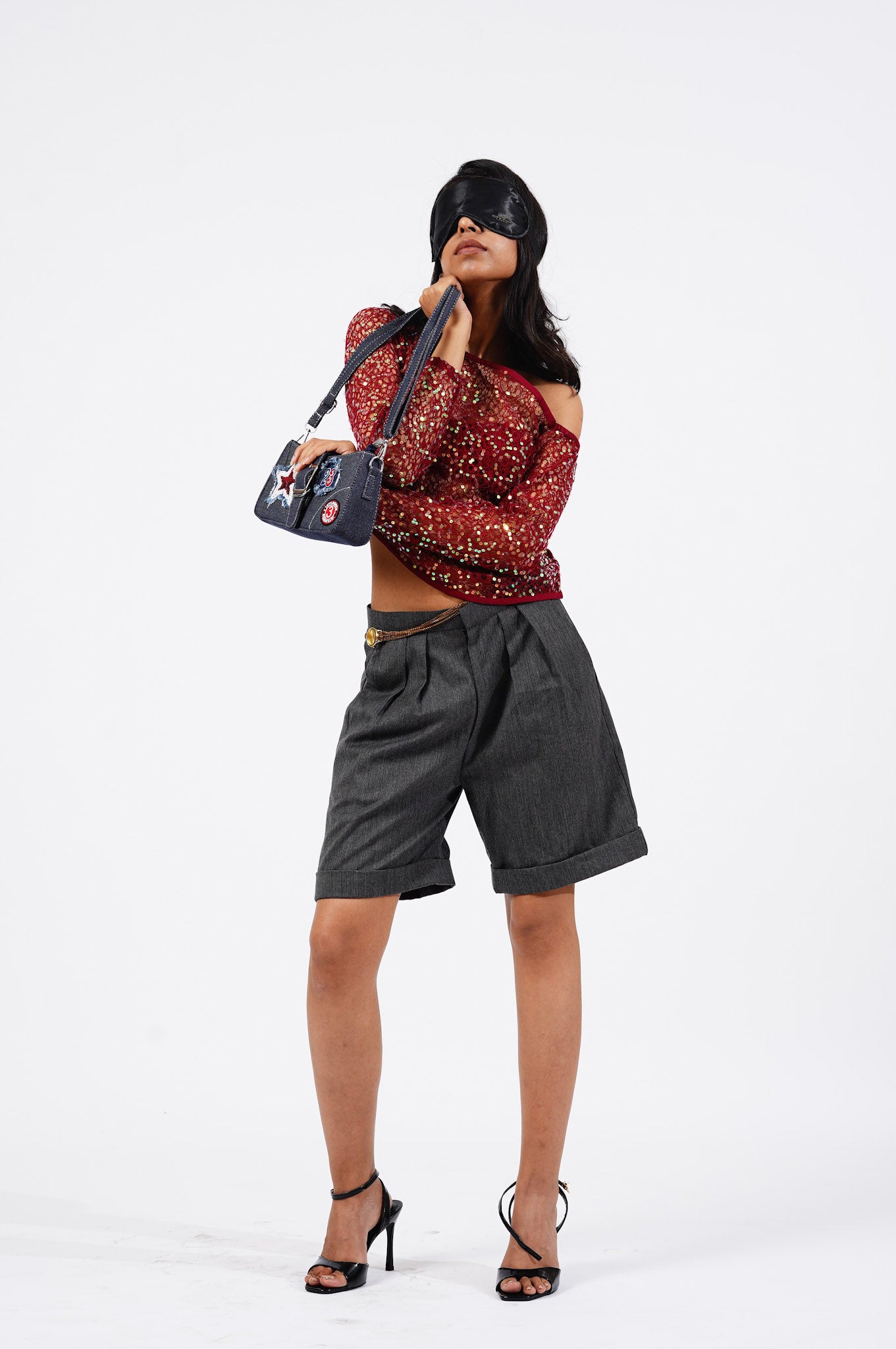 Wear it with low-rise trousers, denim minis, or tailored shorts like we did. If you’re keeping the bottom simple, let the top do all the talking. Add gold hoops, slick bun, done.