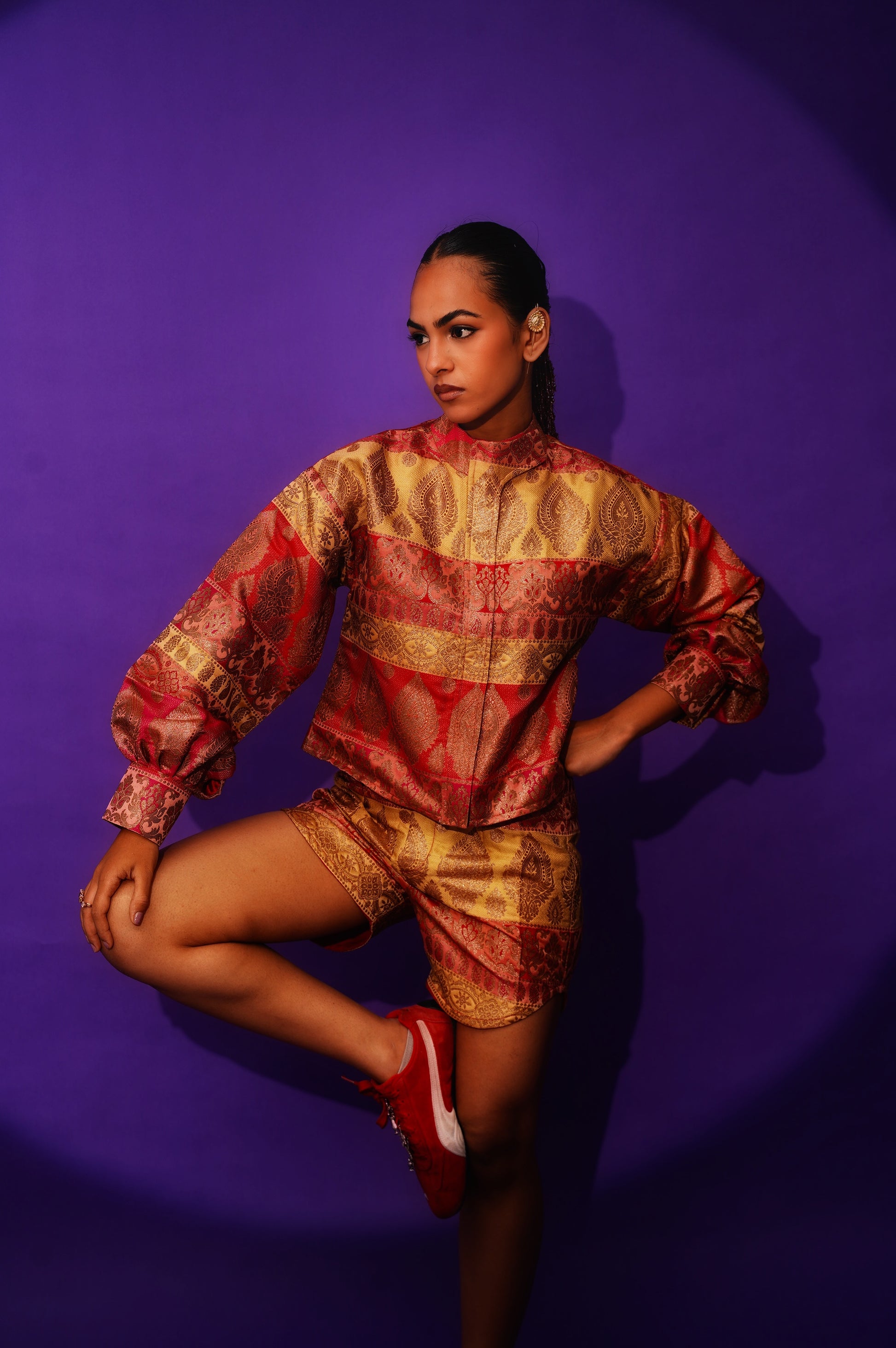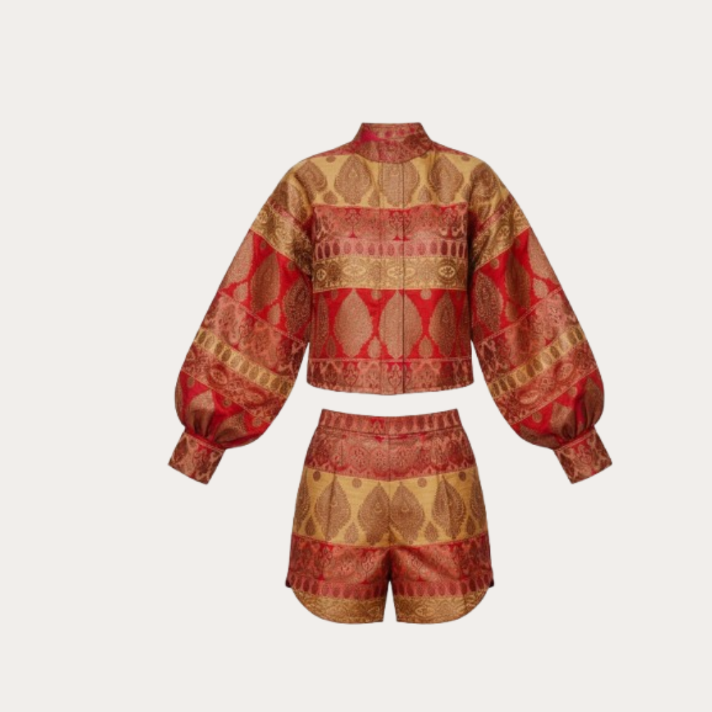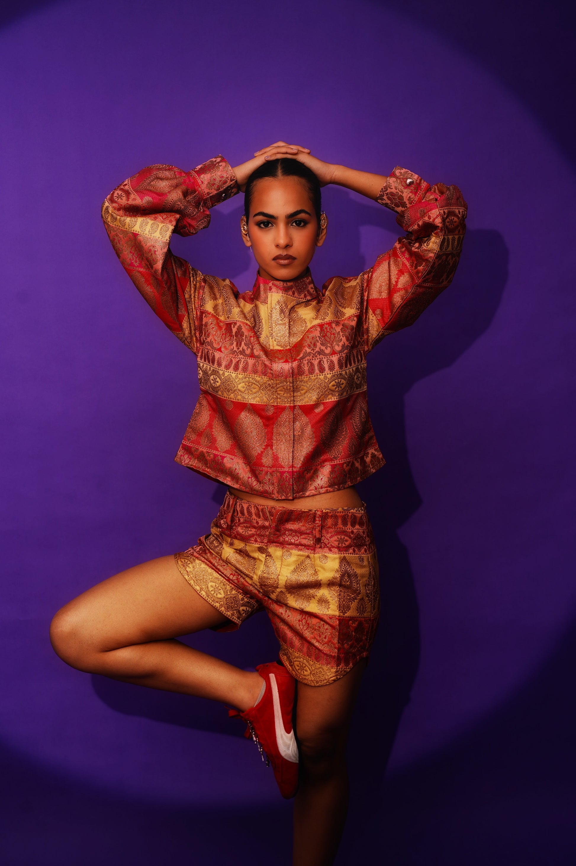 - Structured co-ord set featuring a cropped jacket and high-waist shorts