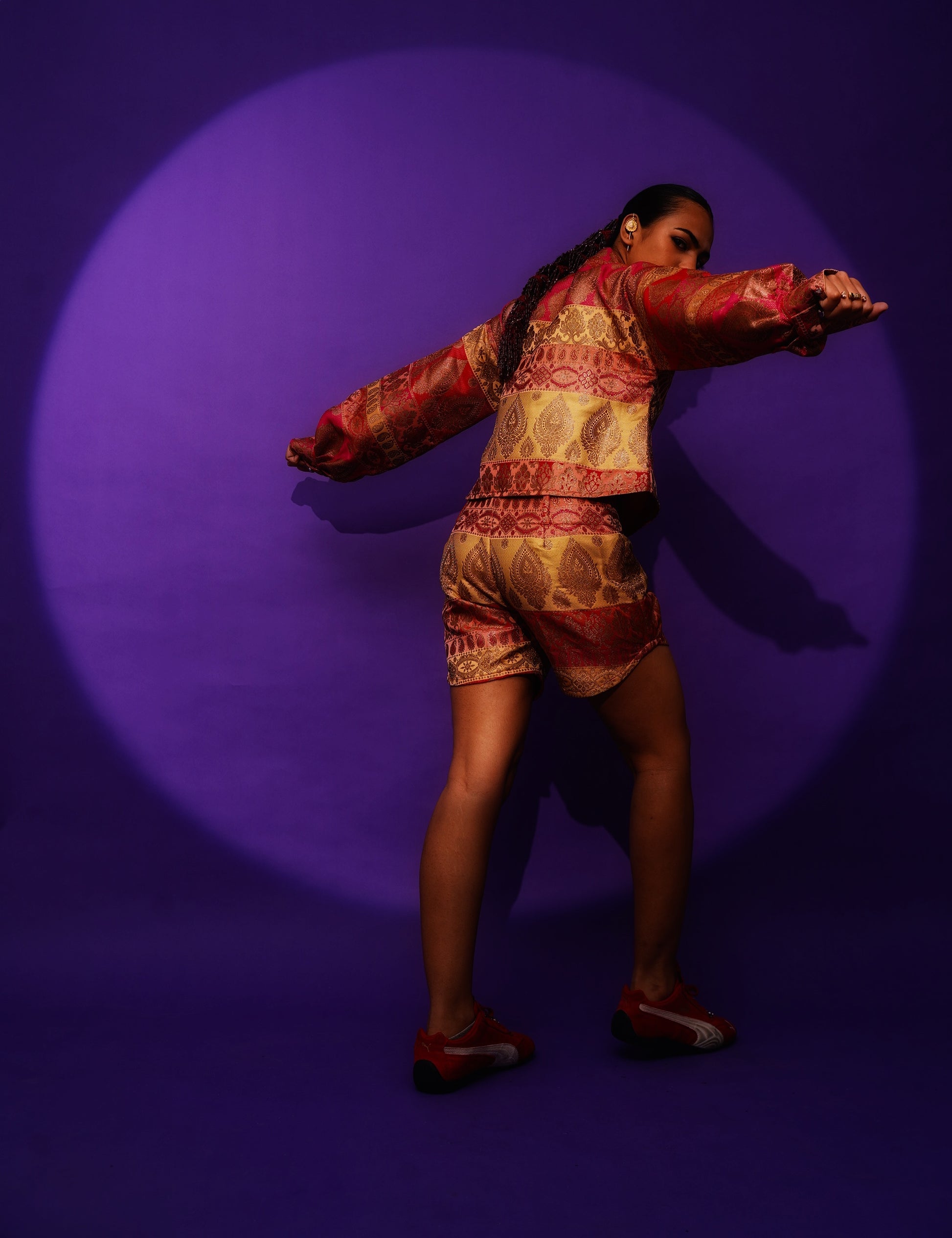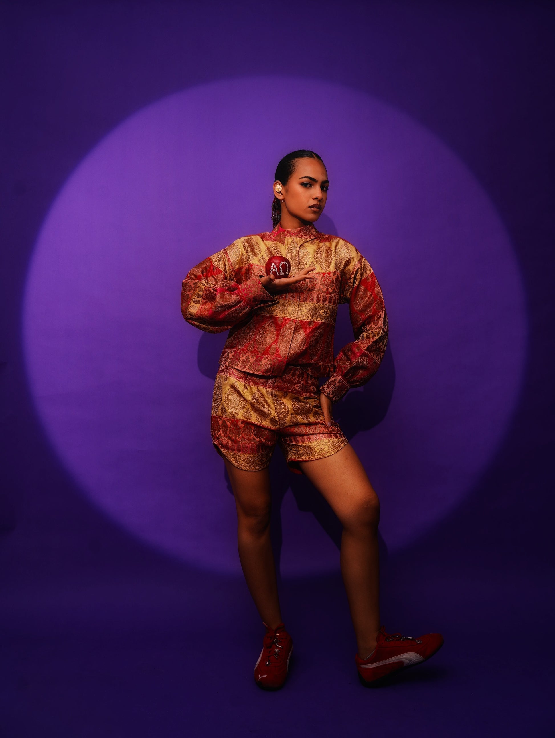 Pair with statement jhumkas and heeled boots for a bold contemporary look.